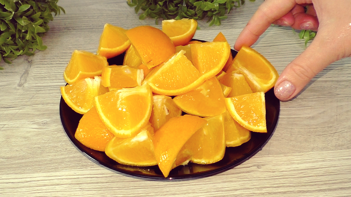 Вынимаем апельсины из морозилки, размораживаем и нарезаем на дольки.