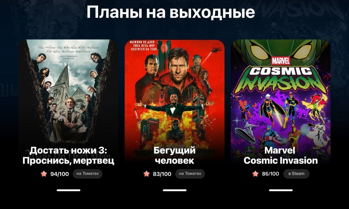 Собрал несколько классных новинок этой недели, чтобы выходные прошли на ура. Вот что советую: 1. «Достать ножи 3» — если ещё не видели, самое время. Детектив, от которого невозможно оторваться. Идём в кино или смотрим дома — оно того стоит. 2. «Бегущий человек» — новая экранизация Кинга от Эдгара Райта. Герой участвует в смертельном шоу, чтобы спасти дочь. Идеально для вечера с попкорном и напряжённым сюжетом. 3. Marvel Cosmic Invasion — олдскульный бит-эм-ап в духе Battletoads. Запускаем с друзьями, берём геймпады и отбиваемся от инопланетян за любимых супергероев. Ностальгия и адреналин гарантированы. Выбирайте своё и отличного отдыха! 😉