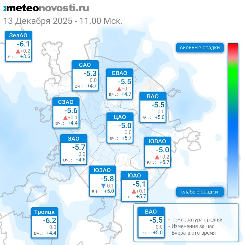 В 11:00 в Москве было от -6.5°C до -4.7°C, средняя температура -5.4°C #погода #Москва #зима #температура #13декабря #суббота