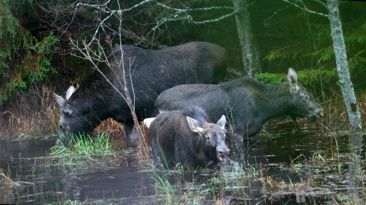 Лоси наслаждаются аномально тёплой зимой и водными растениями