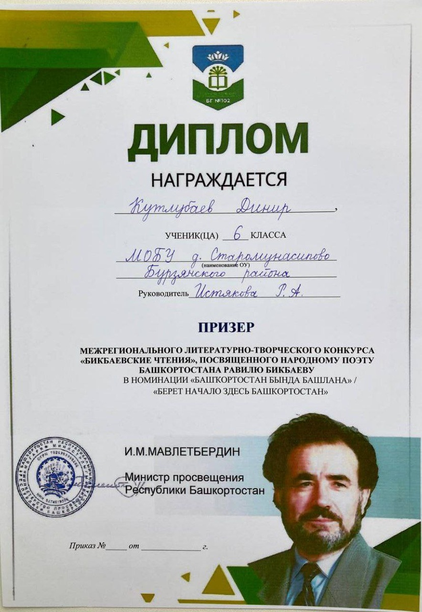 Башҡорт теле көнөнә шәп бүләк.📚 12 декабрь көнө беҙҙең мәктәп уҡыусылары баш ҡалабыҙ Өфөгә , "Бикбай уҡыуҙары" төбәк-ара әҙәби-ижад конкурсына барып, еңеү яулап ҡайттылар. Башҡортостандың халыҡ шағиры Рауил Бикбаев исемен йөрөткән 102 -се башҡорт гимназияһына ул көндө төрлө тарафтарҙан бик күп уҡыусылар йыйылып, шағирҙың әҫәрҙәрен яттан һөйләү, уның тураһында шиғыр яҙыу, фәнни-эҙләнеү эше башҡарыу кеүек номинацияларҙа көс һынаштылар. Алдан уҡыусыларҙың эштәре ситтән тороп һынау үтте, иң яҡшылары гимназия сәхнәһендә сығыш яһау хоҡуғын алды. 6-сы класс уҡыусылары Динир Ҡотлобаев һәм Вилдан Хисмәтуллин Рауил Бикбаевтың "Бул", "Аталар көтәләр улдарын" шиғырҙарын тасуири ятлап, юғары баһалар алып, конкурстың призерҙары булдылар. 8-се класс уҡыусыһы Денир Һатыбалов шағирға бағышлап шиғыр ижад итеп, еңеүсе тип билдәләнде. Ижади уҡыусыларыбыҙға артабан да шулай тырыш, әүҙем булыуҙарын, матур еңеүҙәре менән беҙҙе ҡыуандырып тороуҙарын теләйбеҙ! Балаларҙың ата-әсәләренә, беҙҙе баш ҡалаға матур