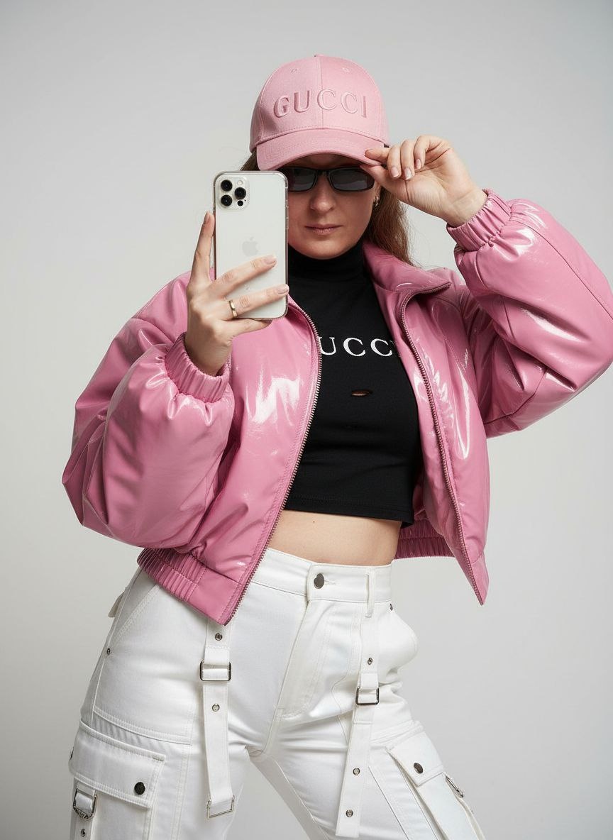 Не меняя внешности женщины с фото, образ уверенной девушки в динамичной позе: слегка наклонила голову вперед, взгляд в камеру прикрывая лицо розовой бейсболкой с вытесненным логотипом <<Gucci» для таинственности и ускользающего взгляда. В левой руке IPhone 17 pro белого цвета в прозрачном чехле у лица, правая рука касается козырька кепки, придавая спонтанность. Объемная глянцевая приталенная розовая куртка с мягкими отражениями, под ней укороченный черный топ с белой потертостной надписью «GUCCI», плотно облегающий торс, высокие белые брюки с карманами, заклепками и ремешками в уличном спортивном стиле. Текстура брюк комбинирует матовые и блестящие участки, полосы и швы создают сложный визуальный образ. Мягкое дневное освещение с едва заметными тенями под подбородком и вдоль тела, фон без деталей для фокуса на фигуре и текстуре одежды. Кинематографический портрет с контрастами светотени, чувством движения и загадочностью фотореалистичное 4K с высокой детализацией и качеством https://t