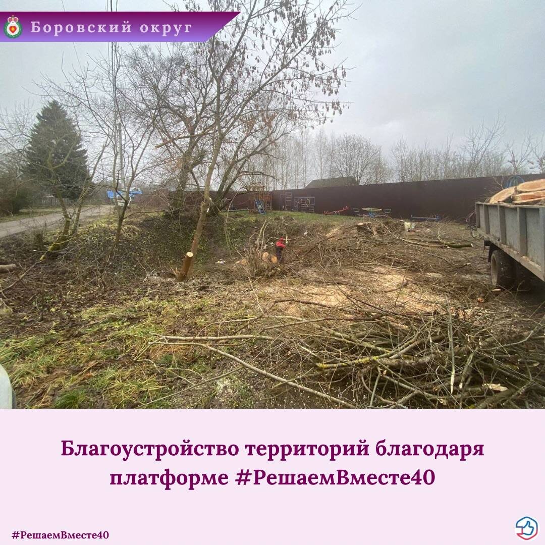 Вы обращаетесь на портал #РешаемВместе40 - мы решаем! ✔️Один из недавних примеров — оперативный вывоз спиленных веток с улиц Боровска. На улице Прудной жители обратились с просьбой навести порядок на территории, прилегающей к детской площадке. С инициативой оперативно помог депутат Думы округа Вячеслав Иванюшко. Ветки были своевременно убраны, а также оказана помощь в распределении привезённой асфальтовой крошки. ✔️ Ещё один случай — на улице Труда, где были вывезены спиленные деревья, оставленные подрядчиком детского сада «Бригантина». Работы выполнены в рамках контракта по ликвидации стихийных свалок. Если вы видите проблему — сообщайте на Платформу обратной связи. Вместе мы делаем наш округ чище и комфортнее! 🍀 💚 Подписывайтесь на официальный канал администрации в MAX.