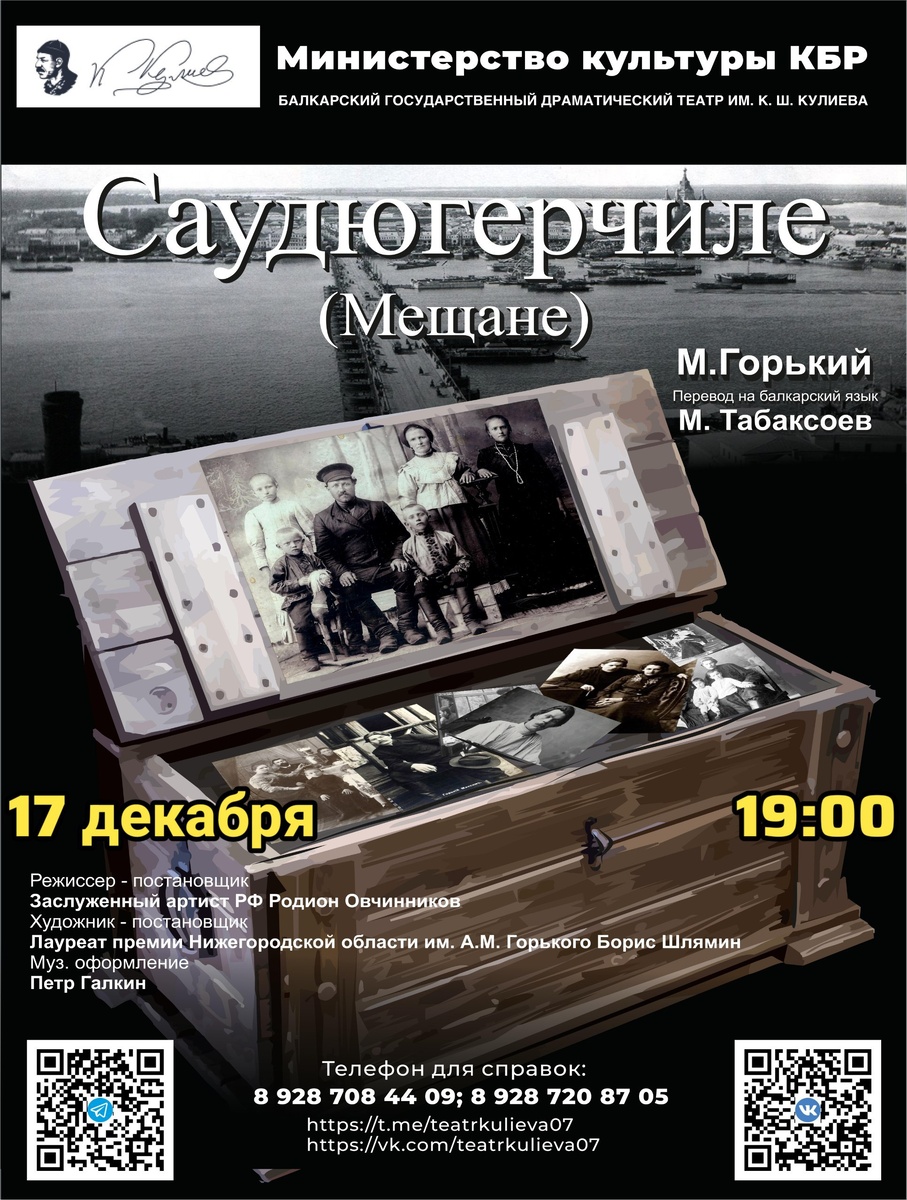 17 декабря в 19:00 Балкарский театр представляет спектакль по пьесе М. Горького «Мещане» (Саудюгерчиле) режиссера Родиона Овчинникова. Спектакль посвящен теме семьи, как важного столпа нравственности и преемственности поколений. Создатели стремятся рассмотреть разлад семейных связей и способы их сохранения. Текст переводится на русский язык, билеты доступны онлайн и по Пушкинской карте. Подробности по телефону 89287084409 и справки в Telegram/VK каналах театра.