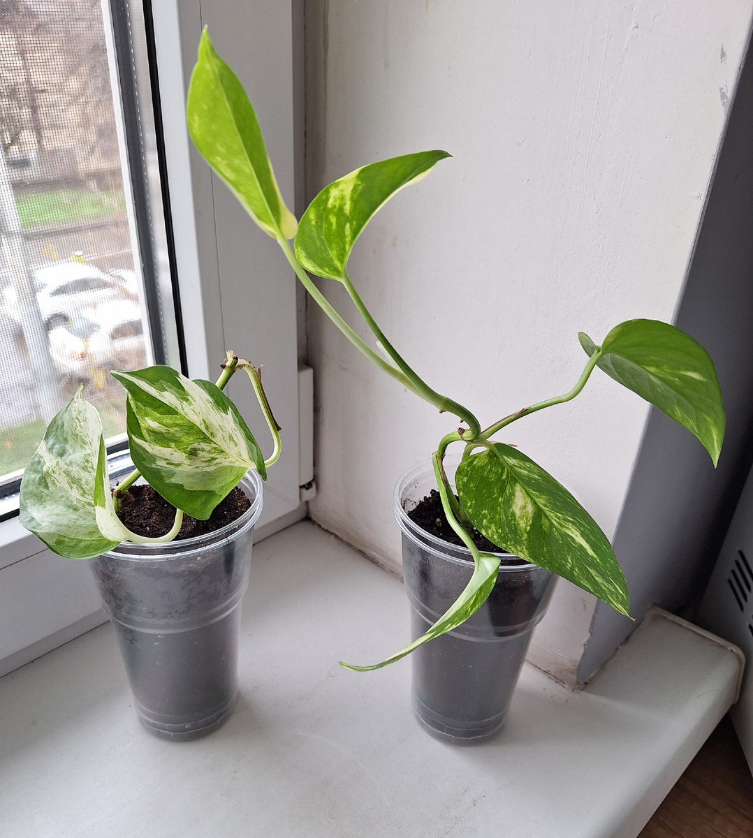 На фото эпипремнум хэппи лиф (слева) и эпипремнум золотистый (справа). Оба можно выращивать лианой либо создать пышный куст (если посадить несколько черенков вместе). Золотистый эпипремнум беспроблемный, быстро наращивает побеги, подходит даже начинающим цветоводам. Хэппи лиф растет немного медленнее, ему нужны условия: грунт, освещение.