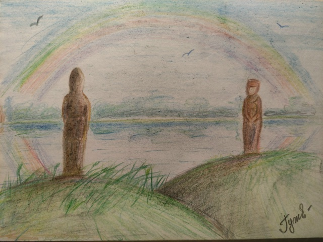 В другое время бы, наверное, молодёжь посмеялась бы над стариком, но теперь.... Ведь и правда, смотрят воин и женщина друг на друга, и радуга никогда не уходит, ни в какое время года....