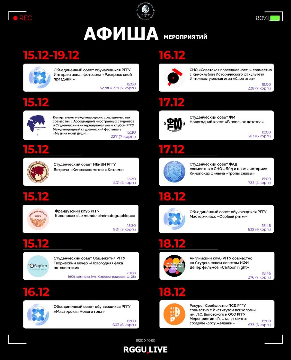 🥳 Афиша предстоящих мероприятий 📢 Объединённый совет обучающихся РГГУ готовит интерактивную фотозону «Раскрась свой праздник!» 📌 15.12–19.12/ 15:00/ холл у 227 (7 корп.) Подробнее здесь 👈 📢 Департамент международного сотрудничества совместно с Ассоциацией иностранных студентов и Студенческим интернациональным клубом РГГУ приглашают на международный студенческий фестиваль «Музыка моей души!» 📌 15.12/ 15:30/ 227 (7 корп.) Подробнее здесь 👈 📢 Студенческий совет ИЕиВИ РГГУ организует встречу «Кинознакомство с Китаем» 📌 15.12/ 15:30/ 801 (5 корп.) Подробнее здесь 👈 📢 Французский клуб РГГУ зовёт на кинопоказ «Le monde cinématographique» 📌 15.12/ 18:45/ 396 (7 корп.) Подробнее здесь 👈 📢 Студенческий совет Общежития РГГУ устраивает творческий вечер «Новогодняя ёлка по‑советски» 📌 15.12/ 20:00/ 1605 комната (ул. Кировоградская, д. 25) Подробнее здесь 👈 📢 Объединённый совет обучающихся РГГУ объявляет о «Мастерской Нового года» 📌 16.12/ 19:00/ 603 (6 корп.) Подробнее здесь