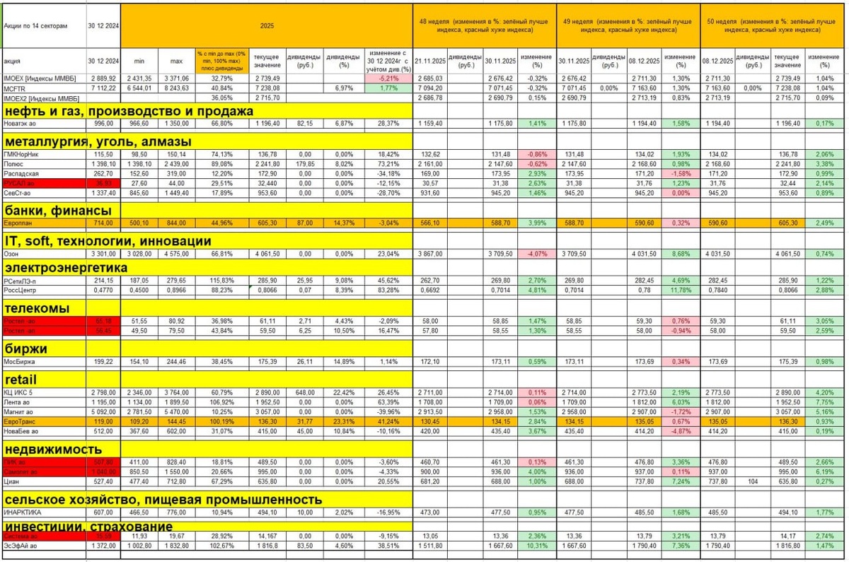 Анализ трендов Какие акции в портфелях и почему Держу в портфелях акции с сильными трендами и сильным фундаменталом С 1 декабря по 12 декабря 23-50 портфель на фонде вырос на 1,72% Индекс IMOEX2 вырос на 1.28% В декабре работают много идей Лента (хорошая отчётность, план удвоения выручки на 3 года, покупка на коррекции по 1740) Озон Ростелеком (спекулятивной рост на ожидании IPO дочек в декабре 25г и в начале 26г.) Полюс (рост золота, локальное ослабление рубля до 80р. за доллар) Ленэнерго пр. (10% чистой прибыли на див. по уставу компании, тарифы на электроэнергию в 25 г 28 г.г. растут быстрее др. тарифов) и другие Сильные сектора Электроэнергетика Ритейл Слабый сектор Нефтянка Нефтяников в портфелях нет. Компании из сильных секторов (Ленэнерго пр., Лента и др. держу) Портфели, действия по портфелям, причины принятия решений Добро пожаловать ! Переход в VIP чат по ссылке https://t.me/OlegTrading_Bot Если нужны специальные условия, пишите в личку: всем отвечу. В большинстве случае