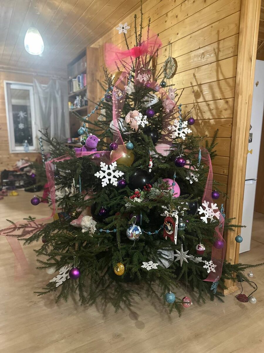 Я её слепила из того что было 😅 На даче явно проблема с игрушками, точнее с их количеством) В ход пошли мягкие, надувные шары, найденные снежинки, в общем всё подряд 🎄 Так ещё намотала гирлянду, слава богу не «роса», а ей выдернули провода 🫣 походу «елочка гори» отменяется…