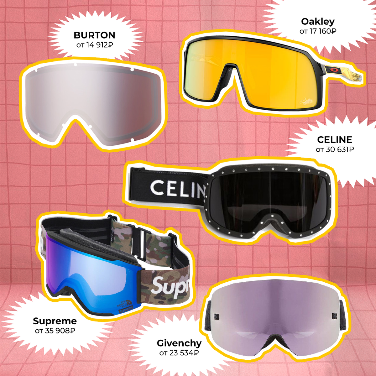 И не только для тех, кто катается: бренды сейчас выпускают модели, в которых и в повседневной жизни будет кайфово. Стиль стилек. BURTON, цена от 14 912₽* Oakley, цена от 17 160₽* Givenchy, цена от 23 534₽* CELINE, цена от 30 631₽* Supreme, цена от 35 908₽* *стоимость может изменяться в зависимости от курса и размера Больше интересного на нашем сайте POIZON