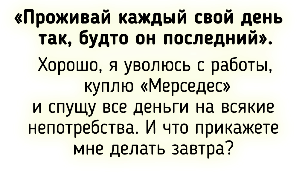 - «Проживай каждый свой день так, будто он последний». Хорошо, я уволюсь с работы, куплю «Мерседес» и спущу все деньги на всякие непотребства. И что прикажете мне делать завтра?