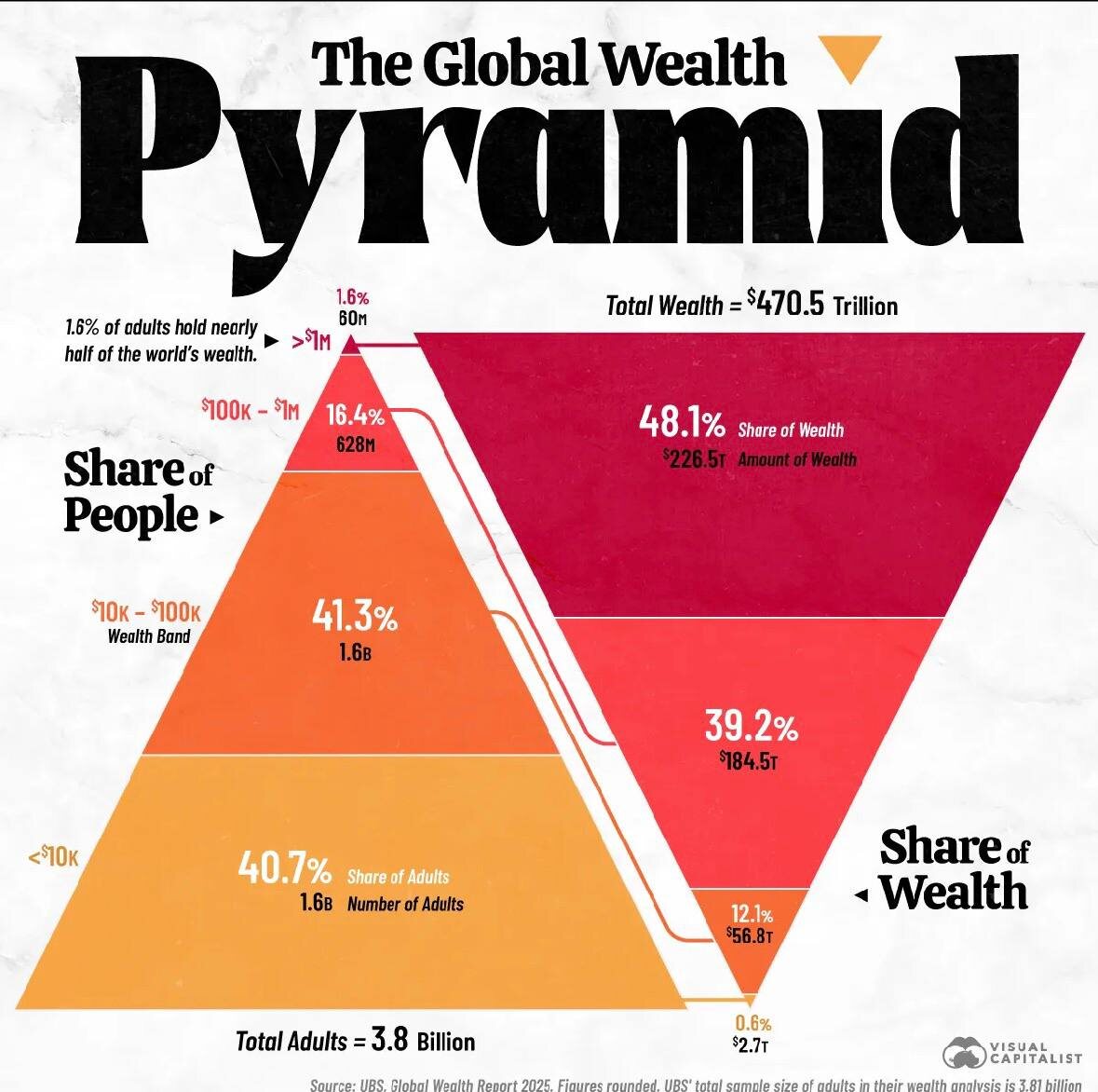 💰Мировое богатство в 2025 На картинке всё выглядит почти карикатурно, но цифры вполне реальные. Всего 1,6% взрослых контролируют почти половину мирового богатства - это около 48%. Это верхушка пирамиды, где деньги делают деньги, а сложный процент работает лучше любой мотивации. Внизу другая реальность. Больше 80% людей на планете владеют примерно 12–13% всего богатства. А у самых бедных, с активами меньше $10 тысяч, вообще менее 1% от общего пирога. Конечно, это не «заговор богатых» и не новость 2025 года. Так работает финансовая система: капитал масштабируется, труд - нет. У кого есть активы, тот внутри лифта. У кого только доход - чаще по лестнице, и то вниз. Мораль тут простая и неприятная: вопрос не в том, справедливо это или нет. Вопрос - в какой части пирамиды вы находитесь и есть ли у вас активы, которые могут расти быстрее инфляции. Остальное - философия 🤷♂️
