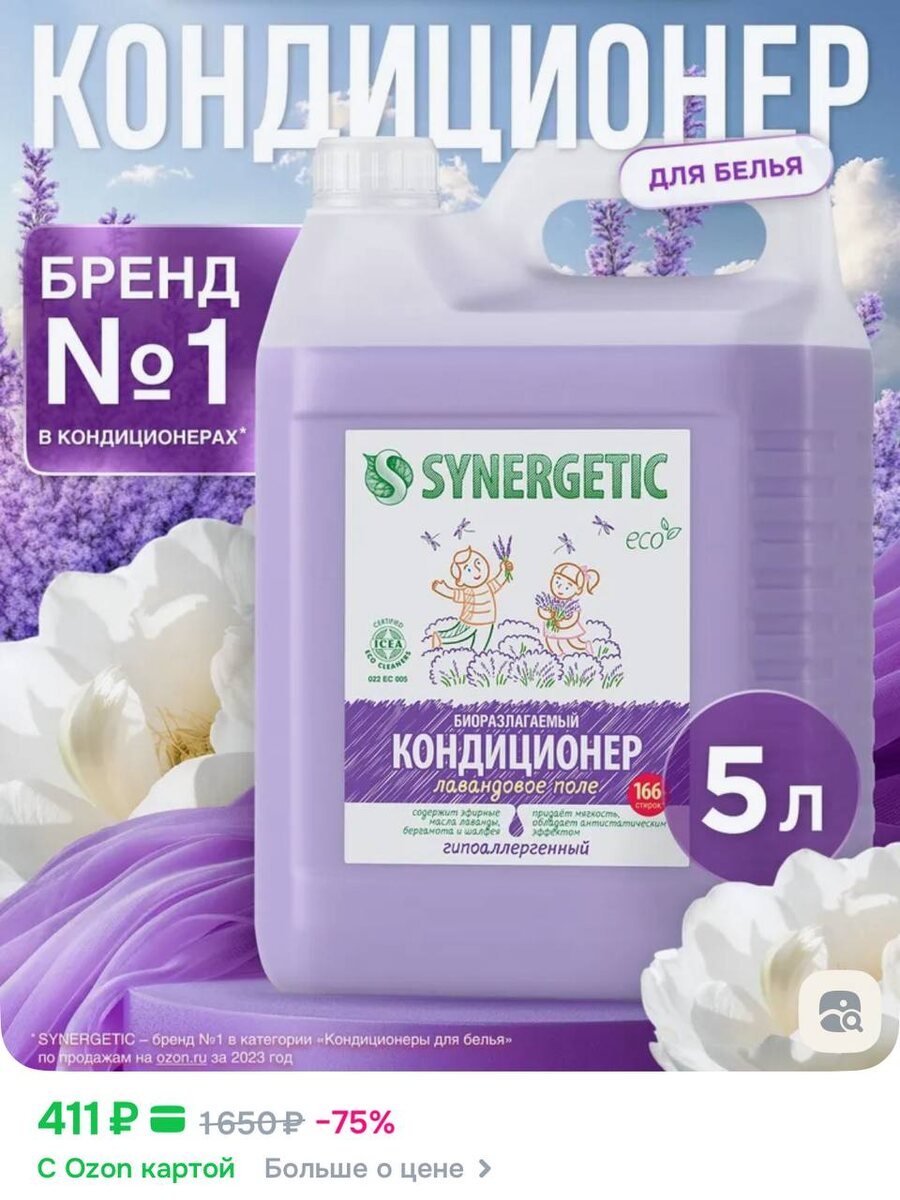Цена с купоном в карточке товара Кондиционер-ополаскиватель для белья SYNERGETIC детский 5л 165 стирок, гипоаллергенный, эко Кондиционер-ополаскиватель для белья SYNERGETIC Лавандовое поле 5л 165 стирок, гипоаллергенный, для всех типов тканей Кондиционер-ополаскиватель для белья SYNERGETIC "Магическая орхидея" 5л, 165 стирок, гипоаллергенный, для всех типов тканей #лучшаяцена