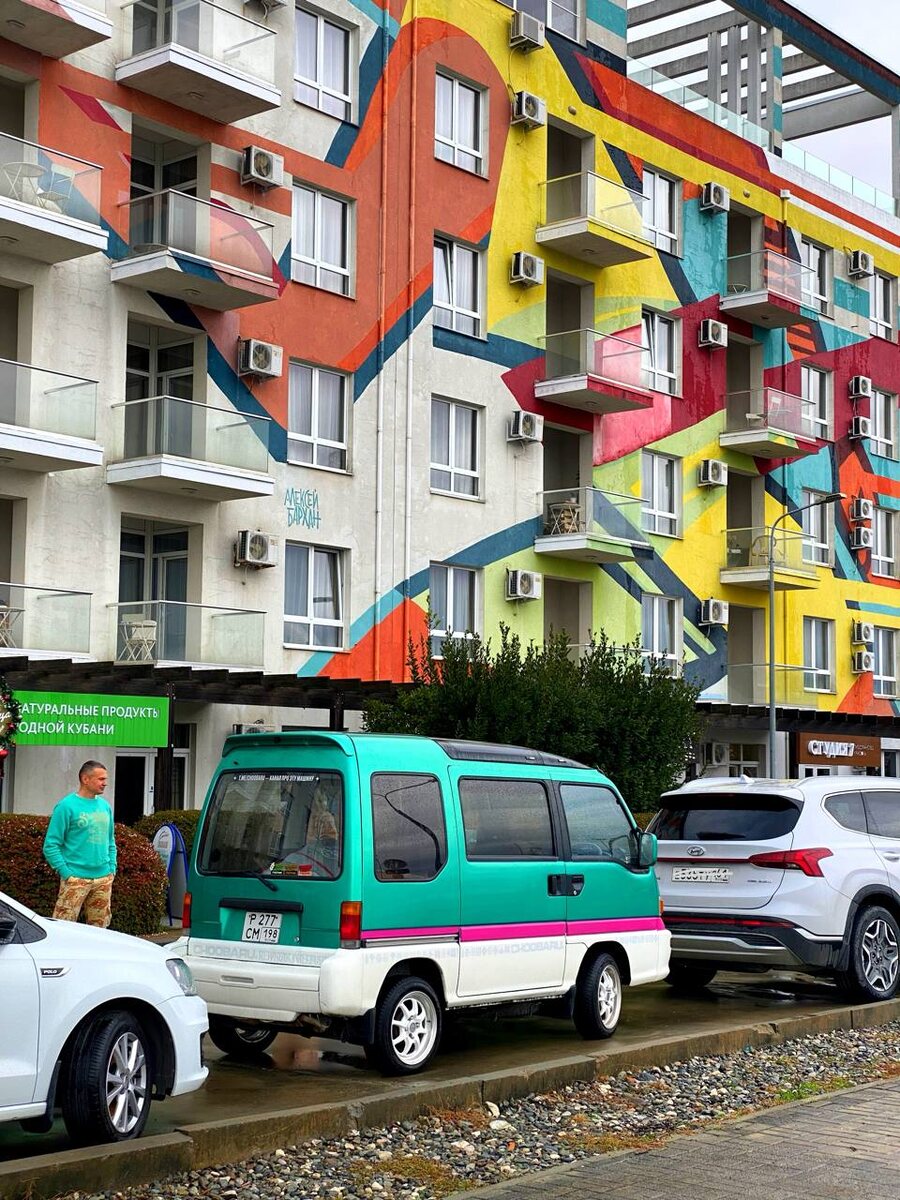 Посетили @sochicarsncoffee, не смотря на погоду, собрали небольшой кворум автолюбителей и обменялись информацией о делах и дорогах. Хороший способ собрать список из мест для посещения на неделю! А на фоне фасад здания оформленный земляком Лешей Барханом @barhanblog (салют! Давно не виделись!)