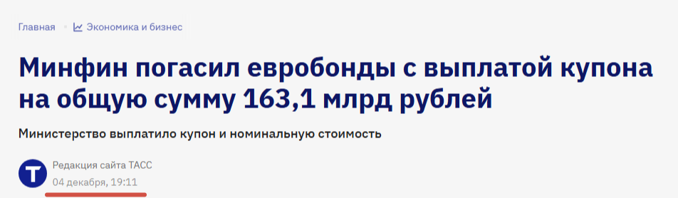 В конце ноябре и начале декабря наблюдалось странное укрепление рубля, которое, казалось бы, происходило вопреки всему. Я неоднократно об этом писал, удивляясь тому, что происходит. Рубль укреплялся до 4 декабря включительно, а с 5 декабря начал обратно резко слабеть. Причем несмотря на то, что с этого момента Минфин в десятки раз увеличил продажи валюты из ФНБ по бюджетному правилу. На что я тоже уже обращал внимание: Сначала рубль, вопреки здравому смыслу и логике, укрепился с 82 до 75 рублей за доллар (то есть, примерно на 10%), а затем курс быстро вернулся обратно выше 80, и может быть пойдет еще выше - пока прошло всего несколько биржевых дней. Что это такое было - все долго гадали, и я тоже. Самое логичное объяснение происходящему я сейчас вижу вот в этой новости: 4 декабря Минфин произвел крупное погашение еврооблигаций ОФЗ на сумму 163 млрд рублей в эквиваленте. И именно 4 декабря наблюдался максимальный курс рубля и, соответственно, минимальный курс всех валют к нему. Более