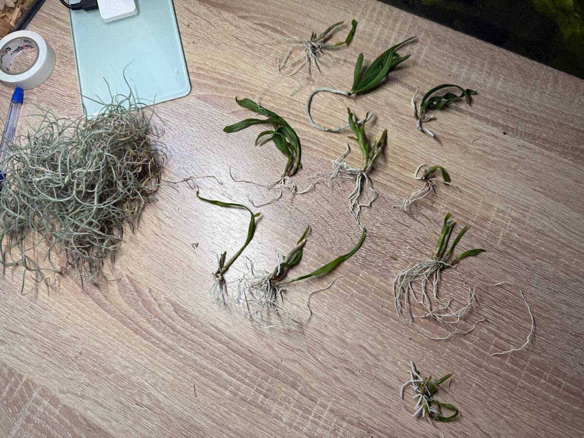 Смотрите, что мне подарили) Я даже не знаю что это мелкое, думала, будет только уснеевидная тилландсия) Уточнила: это несколько дендробуимов и мелкая Ванда! Из Таиланда. Капец :)