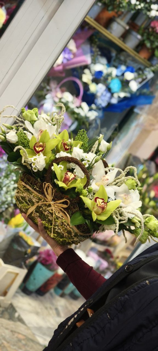 Микс с орхидеями в плетёном кашпо