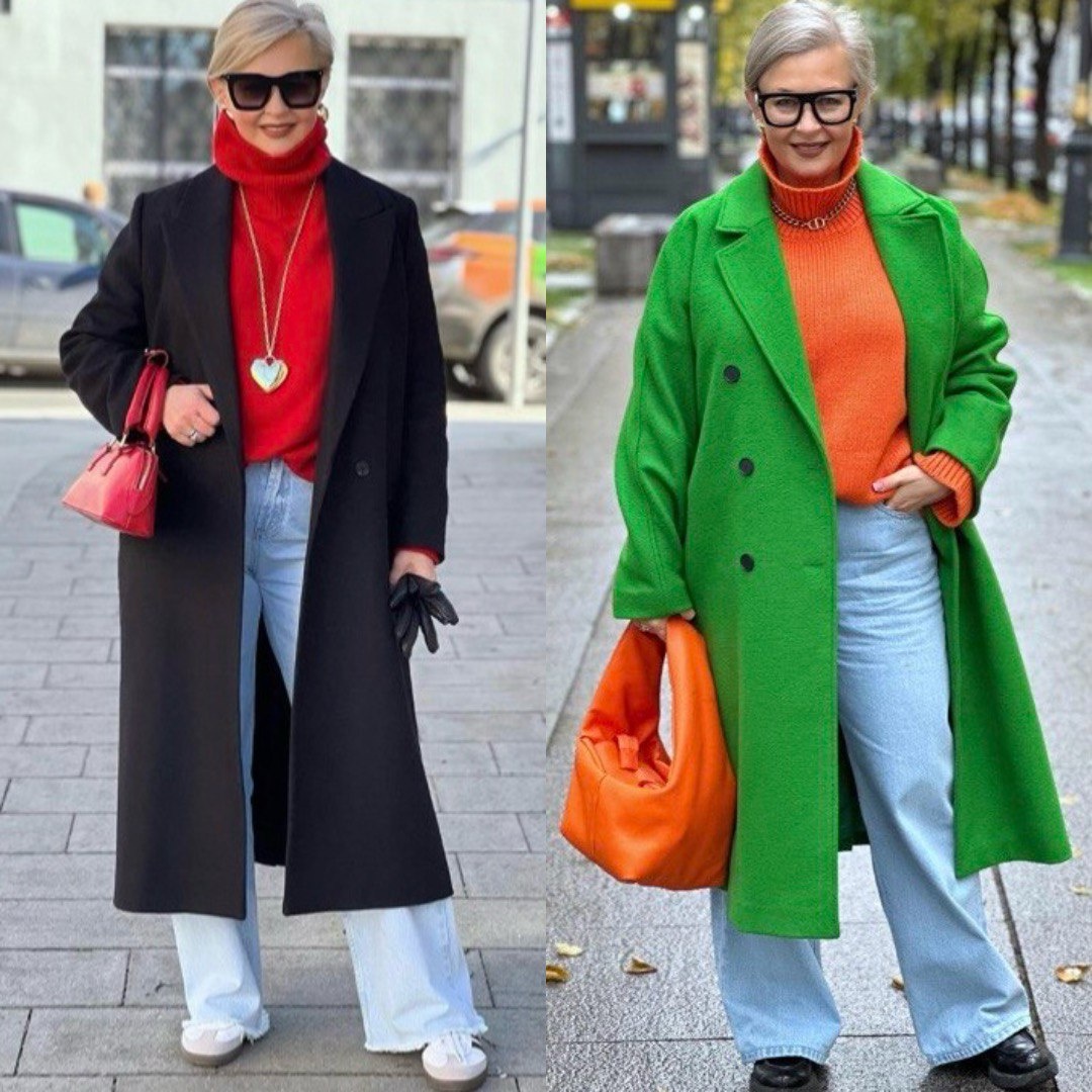Вот снова на просторах интернета наткнулась на фото замечательной женщины Ольги, и Ольга с нами делится своими осенними образами. Вот предлагаю с их помощью проиллюстрировать некоторые вещи. Вот смотрите, в основе этих двух образов практически одни и те же вещи: пальто, джинсы, свитер с высоким горлом. Но как по-разному эти два образа выглядят. На фото слева я вижу стильную, современную, энергичную, очень хорошо одетую женщину, которая следит за трендами, которая может себе это позволить. Образ яркий, такой драйвовый. Видно, что женщина следит за модой, я бы ей дала ну, где-то чуть за 45 наверно. Есть ощущение, что она себе тоже нравится, она в себе уверена, и всё у неё хорошо. А вот на фото справа почему-то такого ощущения у меня нет. Да, интересное, яркое сочетание цветов, но, пожалуй, это единственное хорошее, что можно сказать об этом образе. Я считаю, что такое разное восприятие образов происходит за счет пальто. Вот смотрите, на фото слева видно, даже издалека, что это очень до