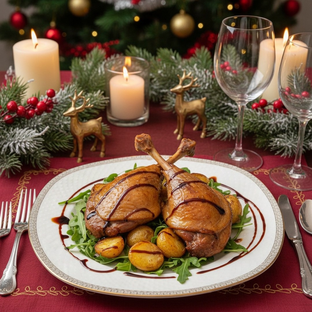 Утиные ножки конфи Ингредиенты ⤵️ 🔸 Утиные ножки — 4 шт. 🔸 Утиный жир — 400 г 🔸 Чеснок — 1 головка 🔸 Тимьян — 4 веточки 🔸 Лавровый лист — 2 шт. 🔸 Соль крупная морская — 1 ст. л. 🔸 Перец чёрный горошком — 1 ч. л. 🔸 Душистый перец — 4 горошины Для подачи: 🔸 Картофель молодой — 500 г 🔸 Руккола — 1 пучок 🔸 Бальзамический крем — 15 г Приготовление🦆 1. Ножки промыть, обсушить, натереть солью. 2. Уложить кожей вверх в форму, добавить чеснок, тимьян, лавр и перец. 3. Залить растопленным утиным жиром, чтобы полностью покрыл. 4. Накрыть фольгой, томить при 130–140°C 3–4 часа до мягкости. 5. Извлечь из жира, при желании обжарить кожей вниз до хруста 2–3 минуты. 6. Подавать с картофелем, обжаренным в утином жире, на рукколе с бальзамическим кремом. Рецепт дня #утиные_ножки #конфи #мясо #утка #птица #гарнир #картофель #зелень #новогодний_стол