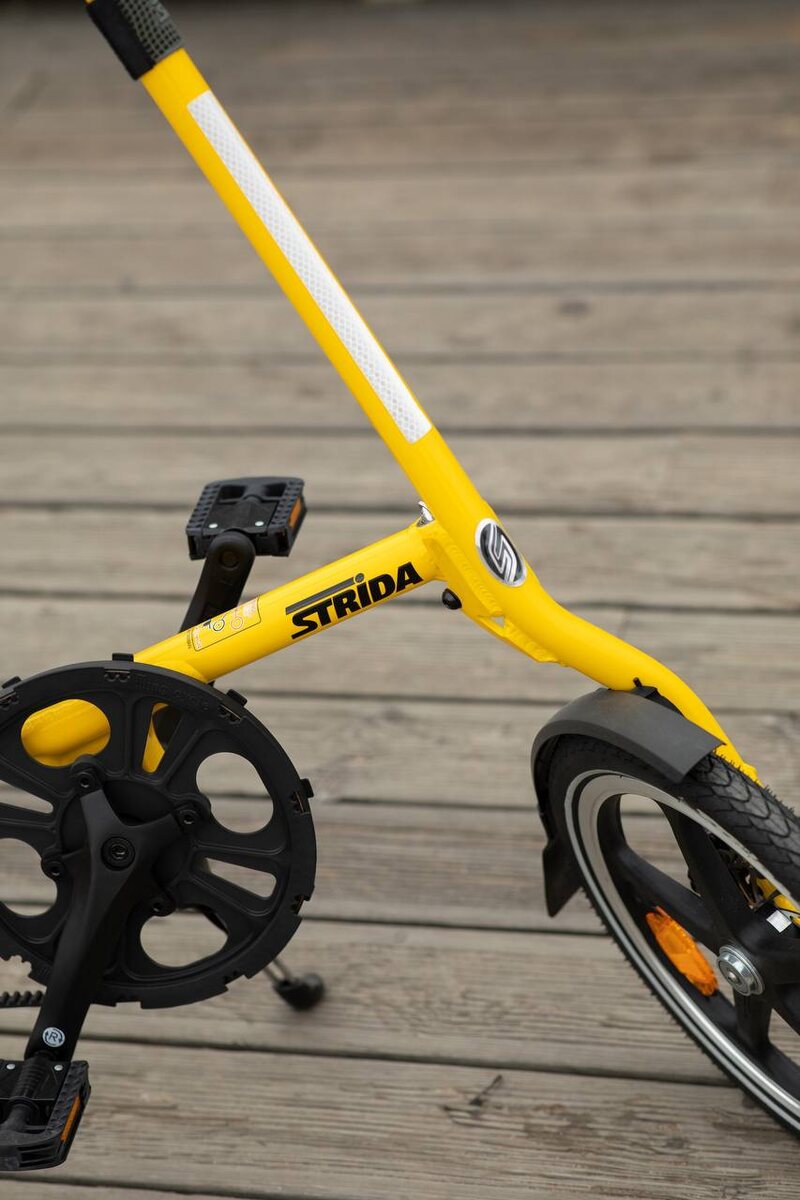 STRIDA LT — взрослый складной велосипед с акцентом на детали. Главное отличие от других STRIDA — оригинальные колёса: алюминиевые обода с ударопрочными пластиковыми спицами. В комплекте также идёт пластиковый багажник. По характеристикам это всё та же классическая STRIDA: