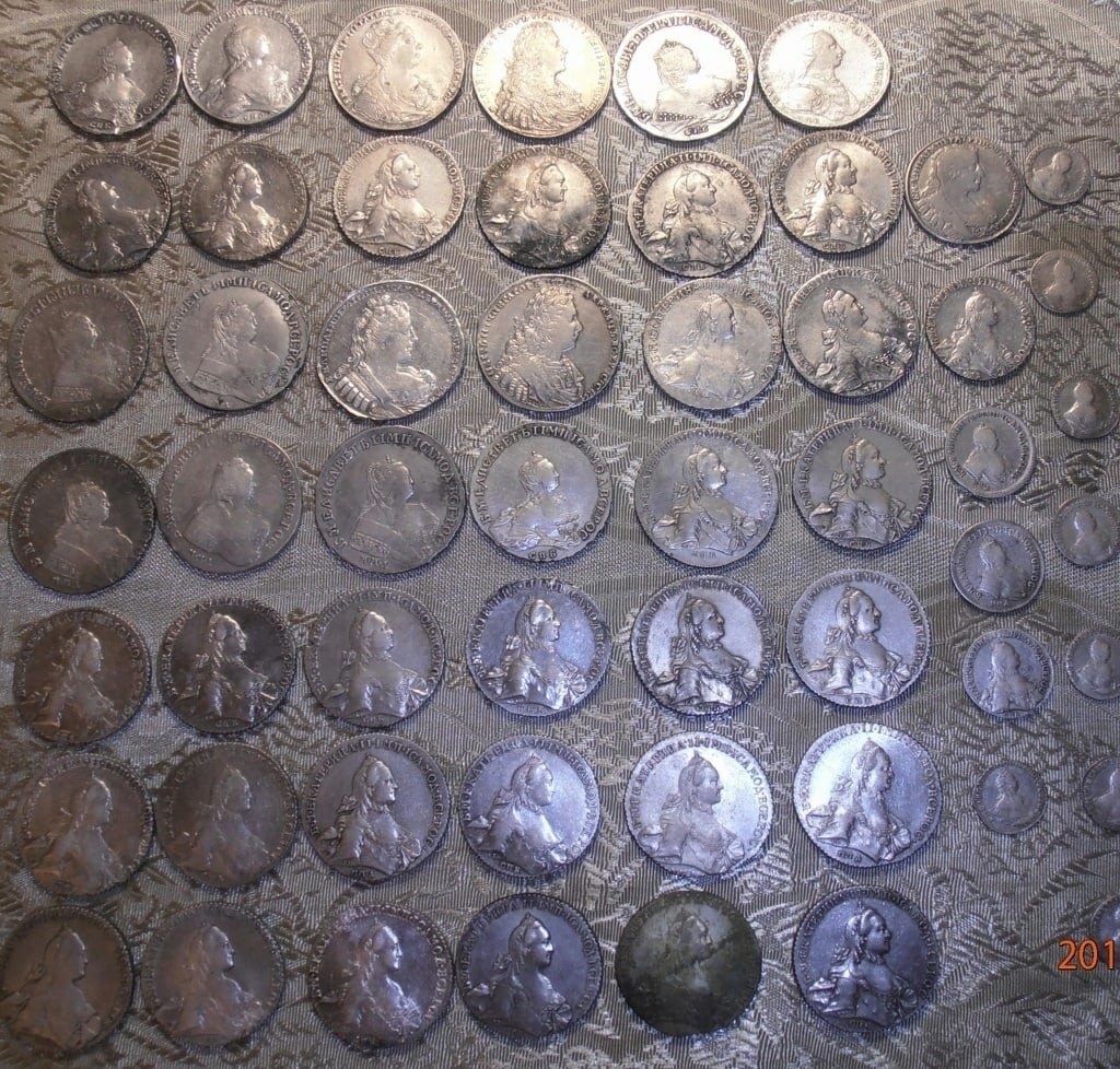 Не спеша иду и тут сигнал, первый на этом поле чистый, красивый, но сильный - нет не верю я тебе ложка подумал я и выкопал на всякий случай комок побольше. Сигнал в комке, все равно не верю и небрежно разрезал ком лопатой... Как не задел Рубль Екатерины 2 не знаю. Ну что обалдел это понятно но клад не первый уже был, долго не прыгал не кричал, да и не известно клад ли еще. Короче говоря стемнело, но я в слепую нашел рядом еще 3 рубля Екатерины 2, ну и пошел к машинам радовать товарища. Впереди был самый интересный второй день.