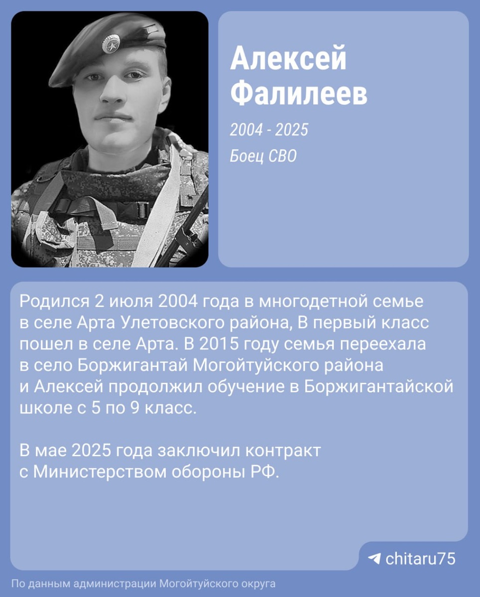 20-летний забайкалец погиб на СВО спустя месяц с подписания контракта. В тг-канале Могойтуйского округа пишут, что Алексей был добрым и отзывчивым парнем, всегда помогал людям: В свободное от учёбы время помогал родителям по хозяйству: любил лошадей, помогал обучать их. Боец погиб 16 июня 2025 года. 🟦 «Чита.Ру» в МАХ