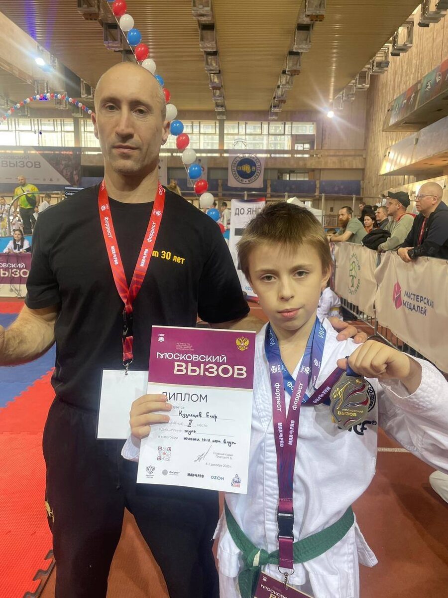 🏆 6–7 декабря 2025 года в Москве состоялся легендарный турнир по тхэквондо МФТ «Московский Вызов», который в этом году получил международный статус. В соревнованиях приняли участие более 3000 спортсменов из различных регионов России и дружественных стран. Команда нашей школы в составе 11 спортсменов под руководством тренера 1 и 3 зданий, а также дошкольных отделений, мастера спорта России Ястребова Сергея Сергеевича, достойно представила школу на этих престижных соревнованиях. 🎖 Результаты выступления команды — 14 медалей: 🥇 5 золотых 🥈 5 серебряных 🥉 4 бронзовые Особо хочется отметить: — Софию (5 класс), которая дошла до финала и завоевала 🥈 серебряную медаль в дисциплине спарринг, одержав несколько ярких и уверенных побед; — Ульяну (2 класс), ставшую 🥇 победительницей в дисциплине «сила удара» в категории из 82 участников; — также трое наших учеников стали обладателями 🥇 золотых медалей в дисциплине «туль». Спортсмены, которым в этот раз не удалось подняться на пьедестал,