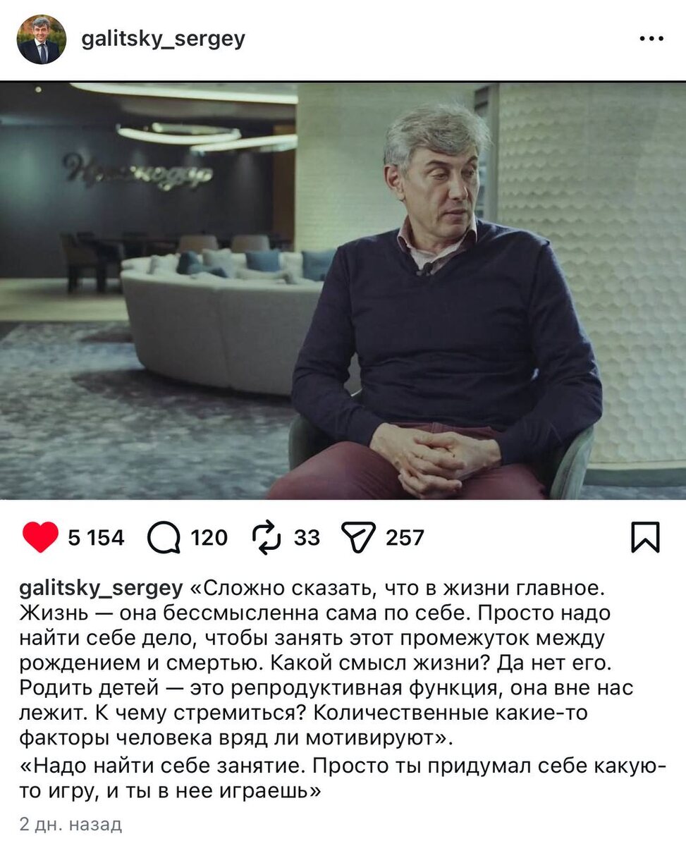Последние пять лет почти каждый день я задаю себе один и тот же вопрос: «А что в итоге?» Перечитав и переслушав уйму книг, я понял: Нельзя понять этот мир умом. Ум человека вшит в картину мира, а картина не может увидеть сама себя. Наблюдать картину в целостности, как она есть, может только наблюдатель, а он — вне ума. Ум линеен: он всегда в прошлом или будущем, но никогда не в настоящем. Ум всегда приводит вас в тупик, потому что он ограничен. Поблагодарите его, так как в тупике возникнет вопрос: «А что в итоге?» Почему скрин с Галицким?! У человека есть все блага этого мира: деньги, статус, признание, уважение, любимое дело. Но он не видит в этом смысла… «Я знаю лишь то, что ничего не знаю. Многие и этого не знают». Сократ.
