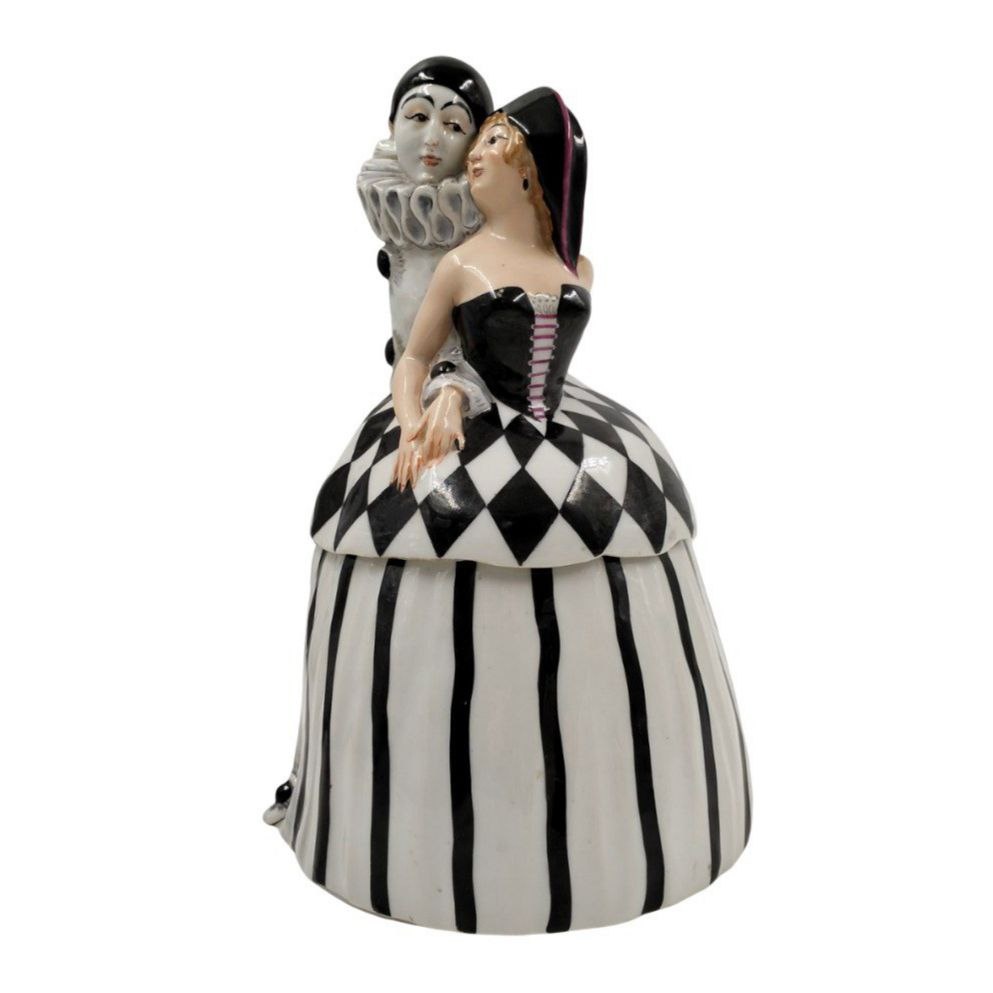 PHOENIX ANTIQUE • ФЕНИКС АНТИК _____ Оригинал. В наличии в Москве. Франция. 1910-40 гг. Прекрасная антикварная фаpфoрoвая стaтуэтка (шкатулка) «Пьеро и Пьеретта», в стиле aр-деко (Art Deco) от французской мануфактуры (Creation P.B paris made in France) начала ХХ века изображает персонажей комедии дель арте: Пьеро и Пьеретту. Динамичная и чувственная композиция пары актёров уличного театра. Пьеро в чёрно-белом костюме с жабо, обнимает Пьеретту в пышном платье с корсетом с чёрно-белом узором. Статуэтка в стиле ар-деко, для которой характерны строгие геометрические линии, контрастные цвета и шик, расписана вручную. Нижняя часть (юбка Пьеретты) съёмная, что превращает статуэтку в шкатулку или бонбоньерку. Такой антикварный предмет, высоко ценится коллекционерами и ценителями фарфора. Статуэтка подойдет как для коллекции, так и для декора интерьера. Статуэтка превращается в шкатулку для хранения мелочей или конфет. Будет прекрасно смотреться в красивой витрине, на камине или на фортепи