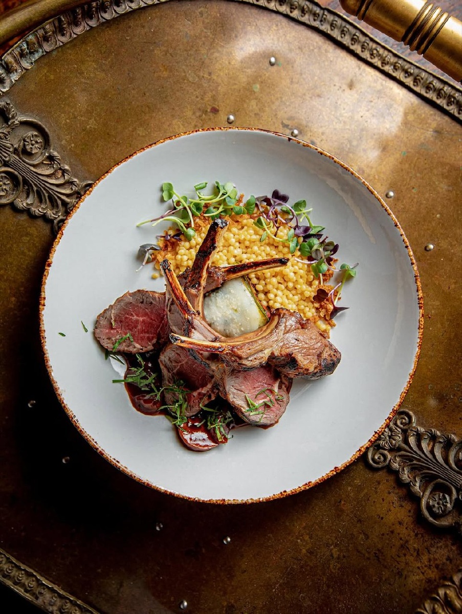 Корейка ягнёнка на гриле с охотничьим соусом на основе демигляса и ягод, рулет из печёных овощей с песто и сыром. Подаётся в «Кафе Пушкинъ» с катанкой на курином бульоне и луковыми чипсами 🤍