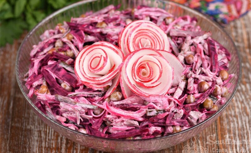 Объясню, почему эти салаты считаю лучшими для празничного стола. Один салат будет мясной сытный с прекрасным вкусом. Второй салат без майонеза легкий воздушный и очень красивый. Вкус у него тоже отличный за счет запеченной свёклы, но запекаю ее не целиком, а кусочками. 1. Салат со свёклой и говядиной. Очень интересная реакция на этот салат у гостей, которые пробуют его первый раз. Он стоит на столе и многие думают, что если там свёкла, то он скорее всего с овощами или селёдкой, но никак не с мясом. И когда они его пробуют сначала маленькую ложечку, потом не могут остановиться. Это семейный рецепт салата. Я и мама готовим этот салат лет 25 точно. Очень вкусный салат. Мякоть говядины (600 г) отвариваем до готовности с добавлением лаврового листа, перца и соли. Остужаем, нарезаем соломкой или разделяем по волокнам. Получится 8-10 порций. Маринованные огурцы (4 больших) нарезаем соломкой и добавляем к мясу. Свёклу (2 шт. среднего размера) предварительно отвариваем или запекаем, остужа