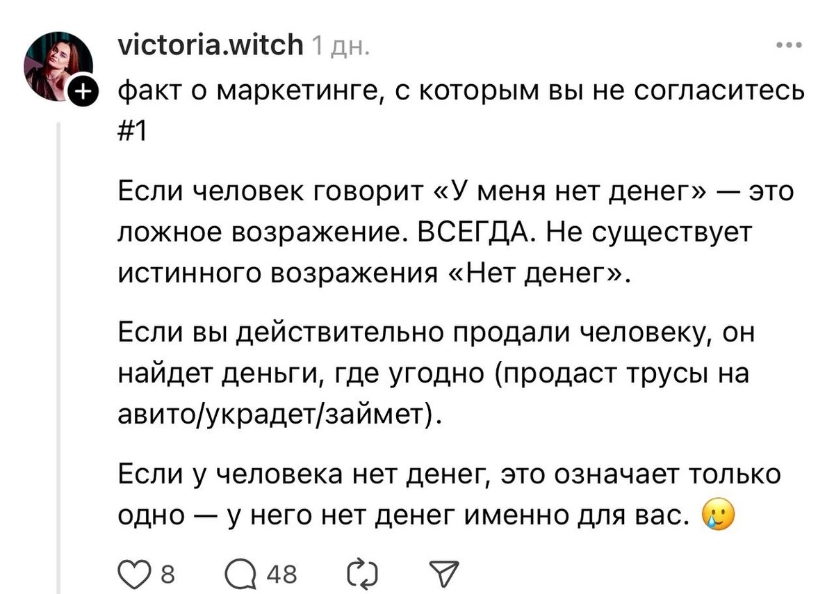 Забавный пост мне сегодня попался в Threads - вроде как от маркетолога, но… Как говорится «все перемешалось в доме Облонских, люди, кони…» В реальности так сейчас многие делают и очень сильно дезинформируют клиентов, намешали здесь маркетинг и продажи в одну кучу, это первое. То есть объективно, всё что написано - уже бред бредовый. Далее, это инфоцыганщина в чистом виде из таких фильмов, как «Волк с Уолл-Стритт» и так далее, в стиле «продай оригинально мне ручку». Если у человека нет денег на новую машину, то у него нет денег на новую машину, даже если он её очень сильно хочет и готов водить эту машину. Или квартиру в Сити, да и в любом месте. Или бутылку Шампанского за 50 000₽. Влезть в долги и продать все что угодно, небезызвестный Аяз уже наглядно показал, чем заканчиваются такие продажи… Но это вообще не маркетинг и мне прям обидно, что потом от маркетологов и SMM направления ждут действий Джина из волшебной лампы 💡