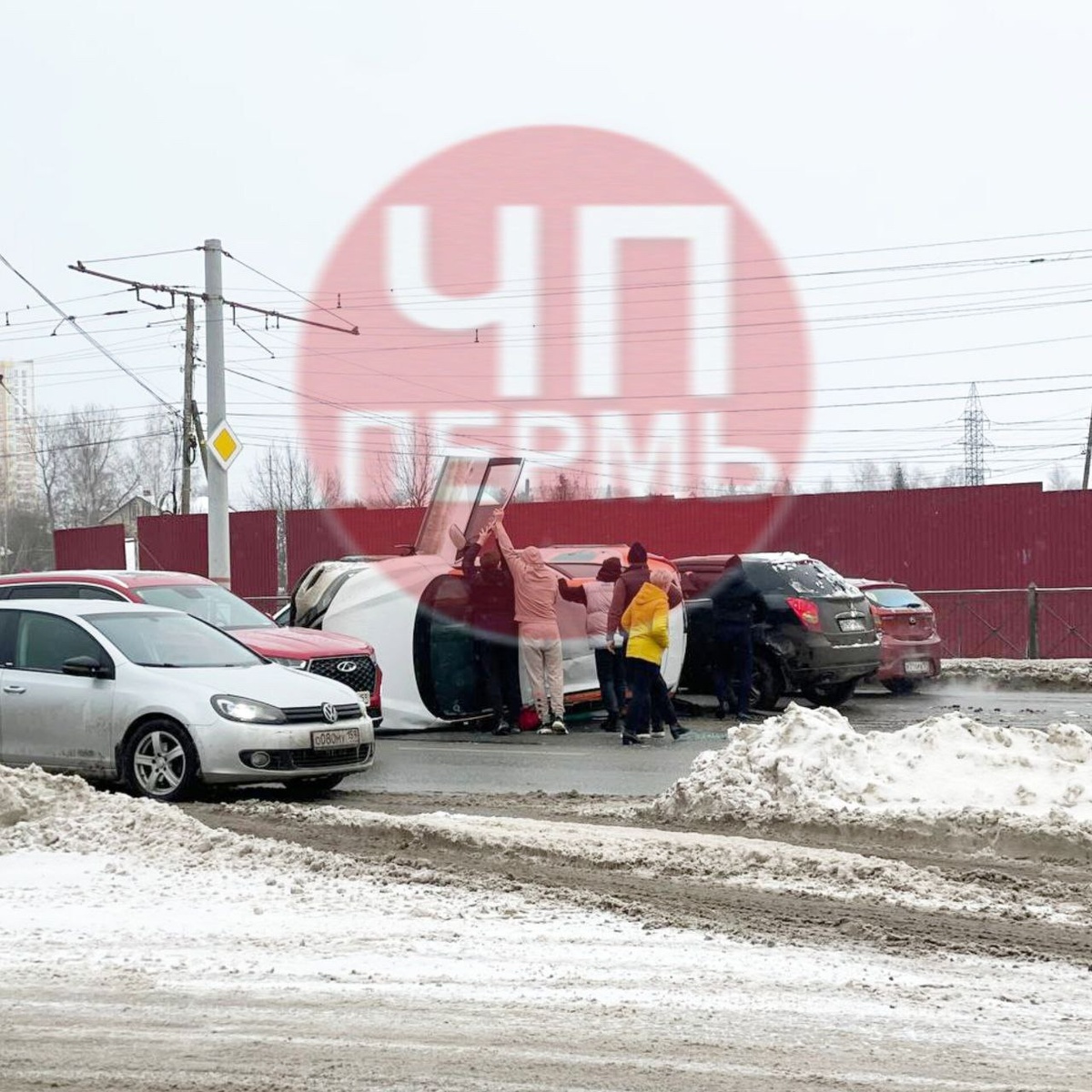 Машина перевернулась на шоссе космонавтов около школы 107 2 корпус