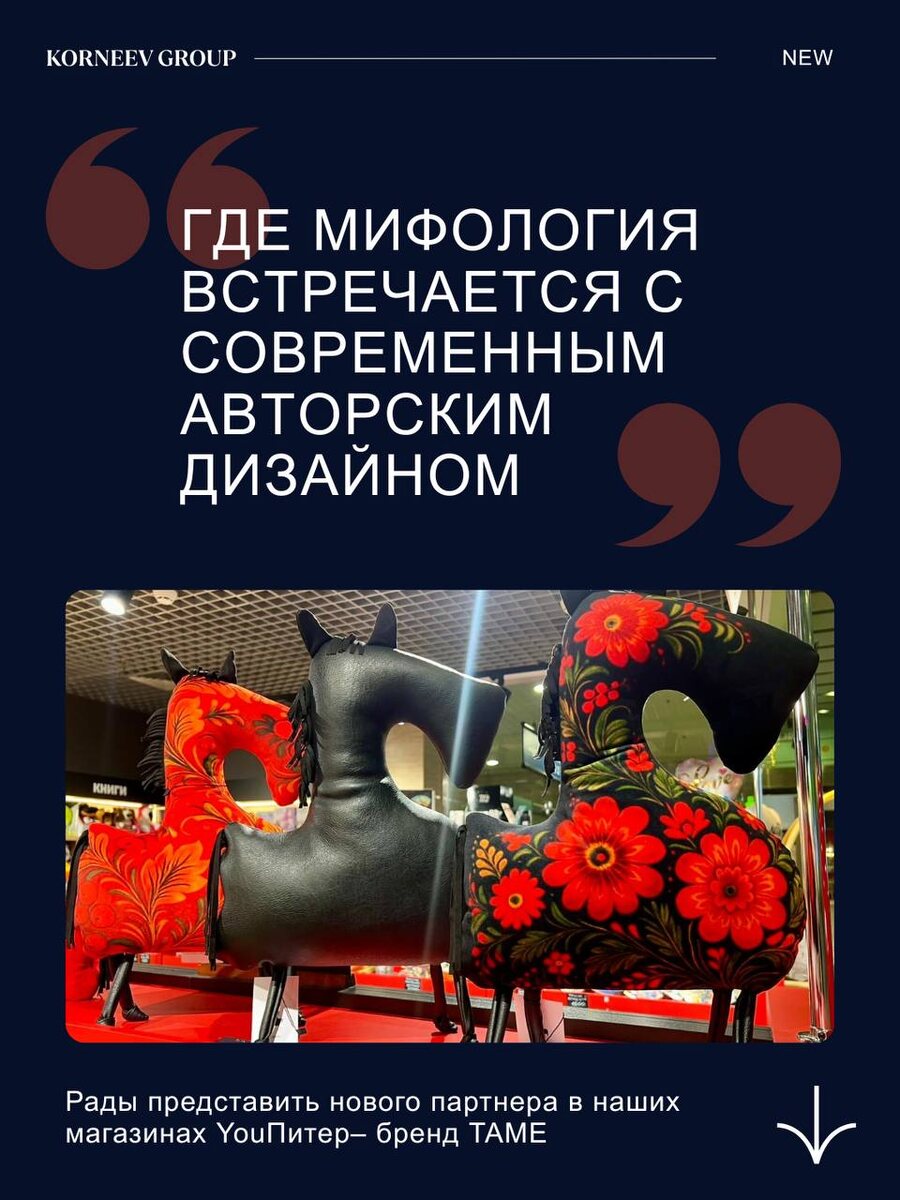 В их коллекции каждый конь становится не просто изображением, а уникальным акцентом, наполненным смыслом. TAME предлагает не просто декор, а предметы, которые приглашают вас наделить их своей историей. В каждом изделии — от подушки до брелка — узнаваемые авторские принты Ирины Тюленевой, она мастерски сочетает глубокий культурный код с бескомпромиссной творческой свободой, создавая ненавязчивый, но глубокий след. Приглашаем вас ознакомиться с ассортиментом в наших магазинах и найти те предметы, которые станут отражением вашей воли и индивидуальности. YOUПИТЕР— во всех ключевых аэропортах страны. #начни_свое_путешествие