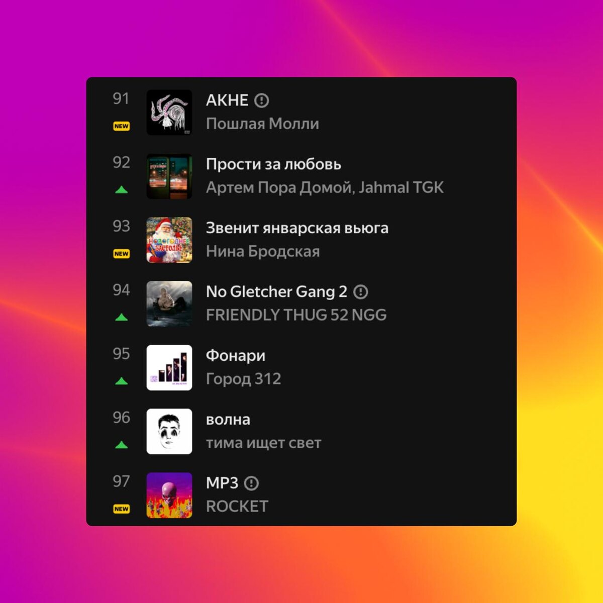 🎵 👑 Пошлая Молли и ROCKET — в чарте Яндекс.Музыки Из новинок этой пятницы в чарте оказался новый трек Пошлой Молли «АКНЕ», а также сингл «MP3» с нового альбома ROCKET «F*ck The Industry». А так, снова чарт потихоньку захватывают новогодние синглы 🎅🎄 @mainstreamusic