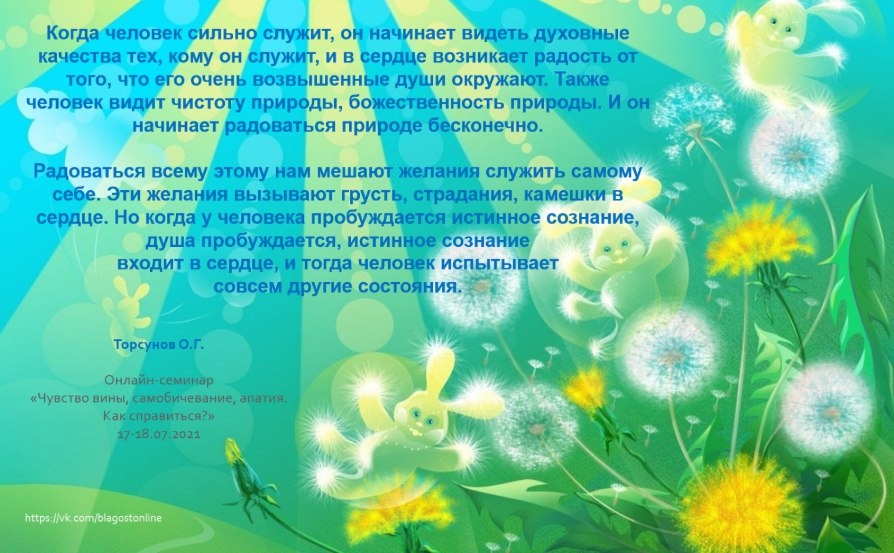 Когда человек сильно служит, он НАЧИНАЕТ ВИДЕТЬ ДУХОВНЫЕ КАЧЕСТВА ТЕХ, кому он служит, и в сердце возникает радость от того, что его очень возвышенные души окружают. Также человек видит чистоту природы, божественность природы. И он начинает радоваться природе бесконечно.