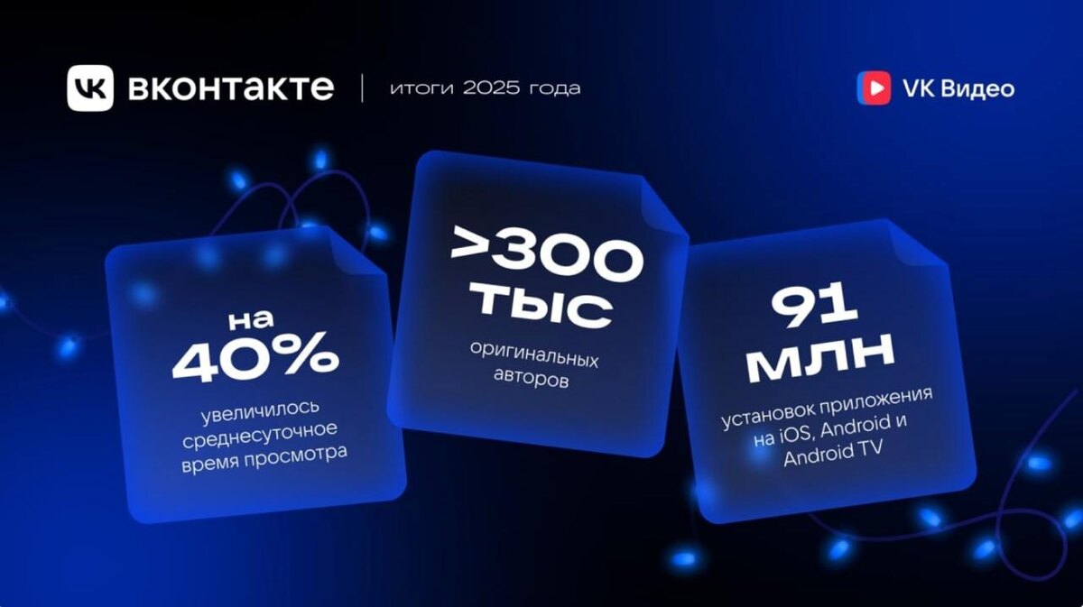 «VK Видео» — итоги 2025 г. По данным Mediascope, сервис «VK Видео» стал лидером в России по размеру ежедневной и ежемесячной аудитории. В первую неделю декабря платформу ежедневно посещали более 40 млн человек, а месячная аудитория в ноябре составила 77 млн пользователей. Сервис показывает активный рост. Среднее время, которое пользователь проводит в приложении за сутки, выросло на 40%. Это связывают с резким увеличением количества авторов и объёма контента. Цифры ✔ Число авторов удвоилось и достигло 331 тысячи. ✔ Количество загружаемых видео выросло в 4,6 раза (в октябре опубликовано 4,16 млн роликов). ✔ Среднее время просмотра за год увеличилось на 15%. ✔ Количество установок приложения достигло 91 миллиона. Самые популярные категории контента ✔ Юмор. ✔ Кино и сериалы. ✔ Новости и политика. ✔ Детский и семейный. ✔ Авто и транспорт. 📱 Про операторов | Подписаться
