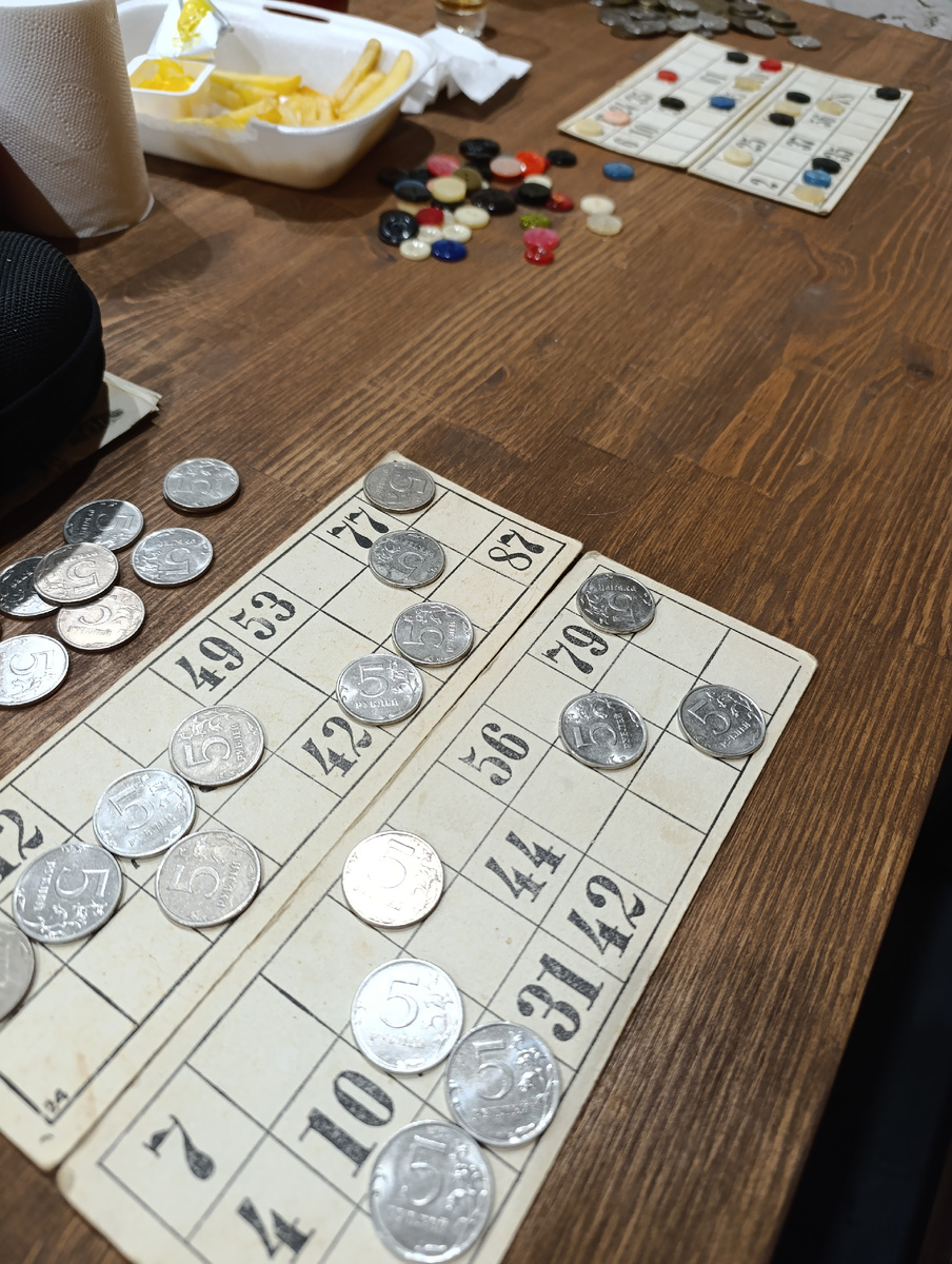 В этот раз звонит мне сын и говорит: "В среду у нас лото, будет 11 человек, каждому по две карты, карта 10 рублей, с собой брать мелочь по 5 и 10 рублей, если согласны приезжайте". Конечно согласны. Тряхнули копилку, поделили мелочь пополам и каждый со своим кулёчком поехал😅.