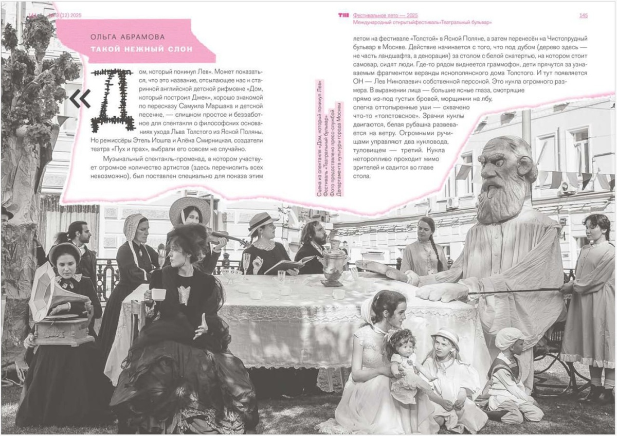 Рассказываем об одном из самых интересных материалов «фестивального» номера «Театрального журнала»! #Ольга_Абрамова пишет о спектакле Этель Иошпы и Алёны Смирницкой «Дом, который покинул Лев», поставленном на фестивале в Ясной Поляне и показанном в рамках фестиваля «Театральный бульвар»: Действие начинается с того. что под дубом (дерево здесь — не часть ландшафта, а декорация) за столом с белой скатертью, на котором стоит самовар, сидят люди. Где-то рядом виднеется граммофон, дети прячутся за узнаваемым фрагментом веранды яснополянского дома Толстого. И тут появляется ОН — Лев Николаевич собственной персоной. Это кукла огромного размера. В выражении лица — большие ясные глаза. смотрящие прямо из-под густых бровей, морщинки на лбу, слегка оттопыренные уши — схвачено что-то «толстовское». Зрачки куклы двигаются, белая рубашка развевается на ветру. Огромными ручищами управляют два кукловода, туловищем — третий. Кукла неторопливо проходит мимо зрителей и садится во главе стола. Этот спек