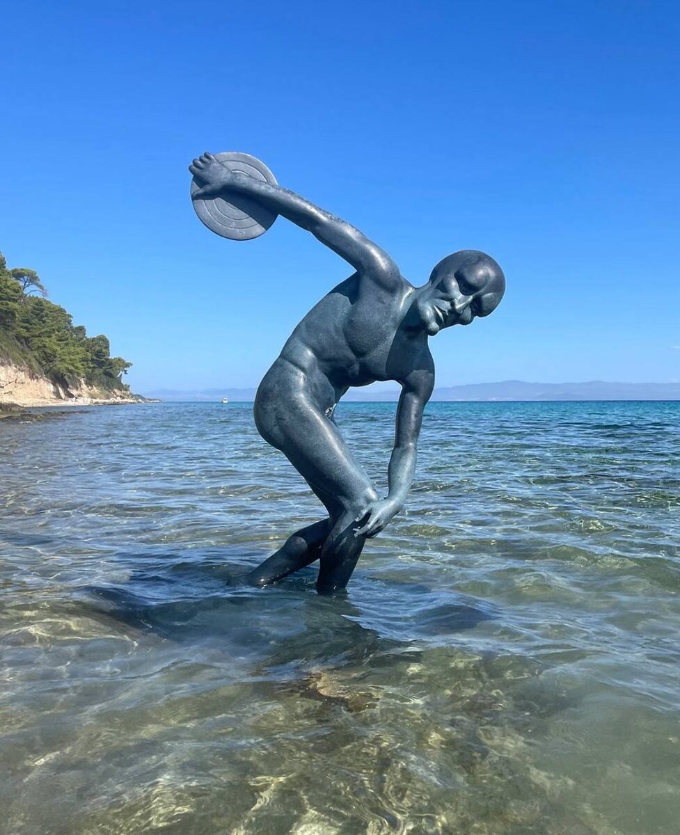 Кто проживет на дне океана? Дис-ко-бол Ги-га-чад! Американский художник и ютубер Sunday Nobody создал пародийную версию античной статуи, но с лицом Сквидварда. В конце перформанса он утопил произведение возле побережья Греции. По словам автора, цель — «запутать будущих археологов»