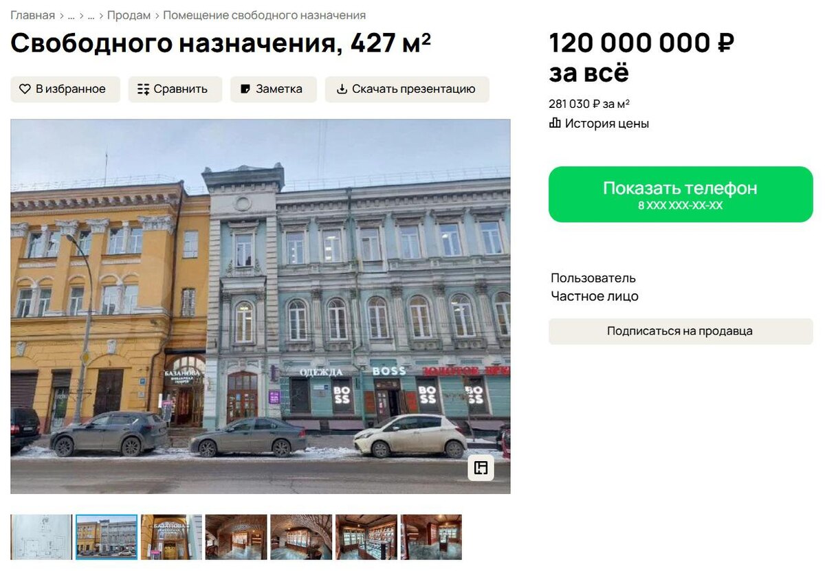 Часть здания-памятника на Карла Маркса в Иркутске продадут за 120 млн рублей В Иркутске на продажу выставили здание-памятник, расположенное на улице Карла Маркса. Его собираются частично продать за 120 млн рублей. Соответствующий лот появился на популярном сервисе объявлений. Речь о здании №29. По данным из перечня объектов культурного наследия федерального, регионального и местного значения, данная застройка, созданная в 1877-1879 годах, являлась Домом Мыльникова И. А. и Зазубрина В. В., а позже тут располагался детский приют Императрицы Марии. Собственник решил расстаться с первым этажом и цоколем, где сейчас размещается «Ювелирная Галерея Базанова». Площадь лота составляет 427 квадратных метров.