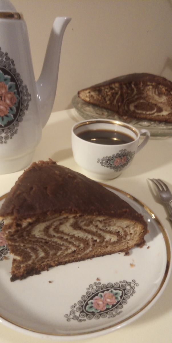 Яйца, сахар, ванильный сахар взбить добела помощью миксера.Продолжая взбивать , добавить сметану. Муку просеять вместе с разрыхлителем , всыпать в яично- сметанную смесь.Взбить миксером до однородности. В 1/3 часть теста всыпать какао-порошок и перемешать миксером.Остальную часть теста оставить как есть. Круглую форму для выпечки застелить пергаментом.Столовой ложкой , начиная с центра , выкладывать по очереди два вида теста , пока они не закончатся. СЕКРЕТ: Чтобы пирог получились с контрастными линиями как у зебры , нужно три ложки простого теста чередовать с одной ложкой теста с какао- порошком. И так далее: три ложки простого теста , а затем одну ложку теста с какао до тех пор пока не закончиться тесто. Поставить пирог в разогретую до 180 градусов духовку на 40 мин. Готовый пирог перевернуть из формы на большое блюдо.Дать остыть и обмазать его шоколадной глазурью. КАК ПРИГОТОВИТЬ ШОКОЛАДНУЮ ГЛАЗУРЬ: Натереть 75г. шоколада и добавить столовую ложку какао , 1/2 стакана сахара ,