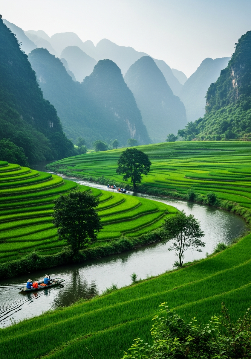 Прогулка на традиционной лодке длится 2-3 часа — гребцы (обычно местные женщины) виртуозно проплывают через низкие своды пещер, а между горами открываются панорамы рисовых полей и древних пагод. Река Нгозянг петляет между карстовыми образованиями, создавая лабиринт водных путей среди зелени джунглей.