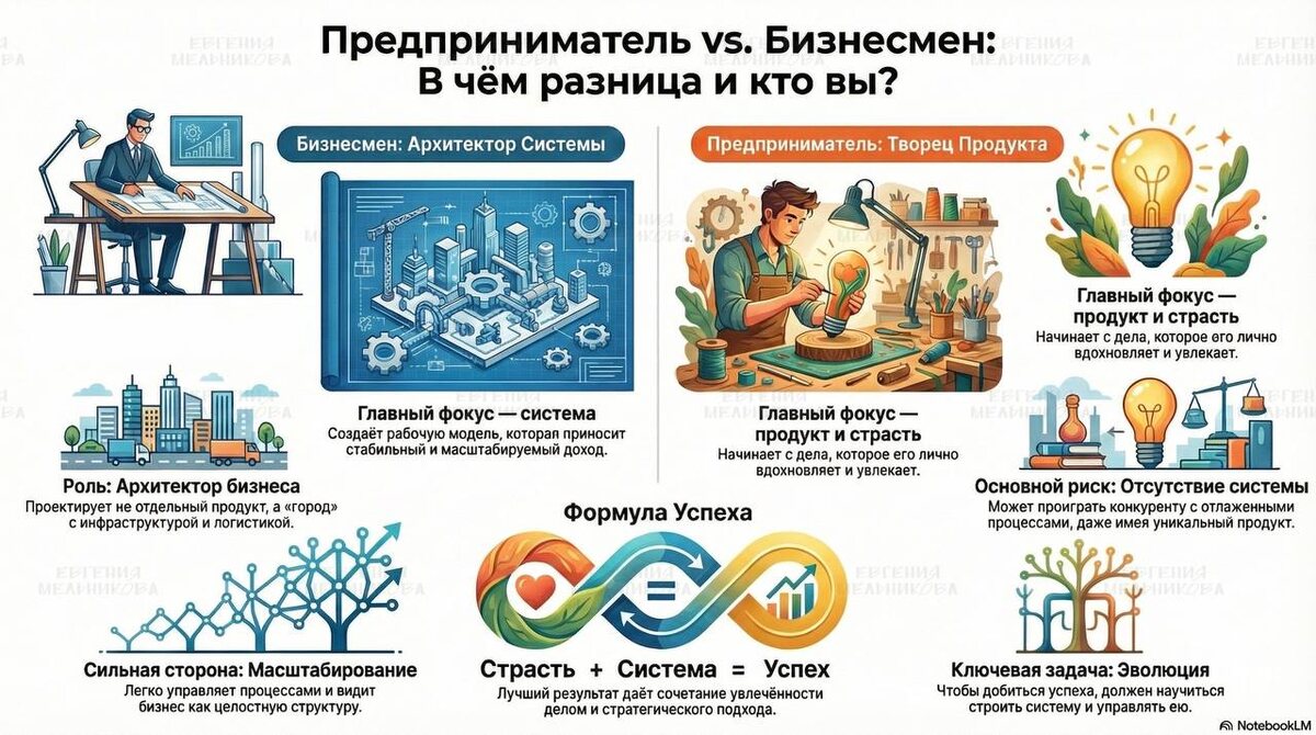 Давайте начнем с самого главного — кто такие предприниматель и бизнесмен. И хотя часто эти два слова используются как синонимы, между ними есть ключевые различия. Бизнесмен — это тот, кто строит систему. Для него важно не просто иметь успешный продукт или услугу, а создать рабочую модель, которая будет приносить стабильный доход. Он как архитектор, который проектирует не просто здание, а целый город с коммуникациями, логистикой, инфраструктурой. Пример? Представьте бизнесмена, который строит фабрику, на которой будет производиться массовая продукция, или завод, который по сути создает деньги — не обязательно быстро, но стабильно. Для него важен не только продукт, а именно процесс и системность, которая позволяет бизнесу быть масштабируемым и прибыльным. А вот предприниматель часто начинает с чего-то гораздо более личного. Это тот человек, который в первую очередь занимается тем, что ему действительно откликается. Его продукт — не просто способ заработать, а страсть, которая вдохновляе