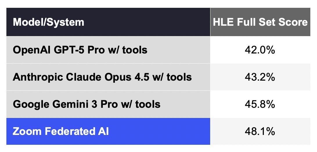 Zoom совершил прорыв в ИИ 😏 Zoom установил новый мировой рекорд в тестировании ИИ, достигнув результата 48,1% на бенчмарке Humanity's Last Exam (HLE) - это на 2,3% выше, чем предыдущий рекорд Google Gemini 3 Pro (45,8%). Получилось у них это благодаря задумке федеративного ИИ Вместо одной модели зумы решили использовать оркестр лучших, комбинация собственных малых языковых моделей Zoom, интеграция с передовыми моделями (OpenAI, Google, Anthropic), проприетарная система "Z-scorer" для выбора оптимальных решений В общем они заколабились с гигантами в ии, подкинули в кучу своих исследований и получили новый мировой рекорд Zoom Blog