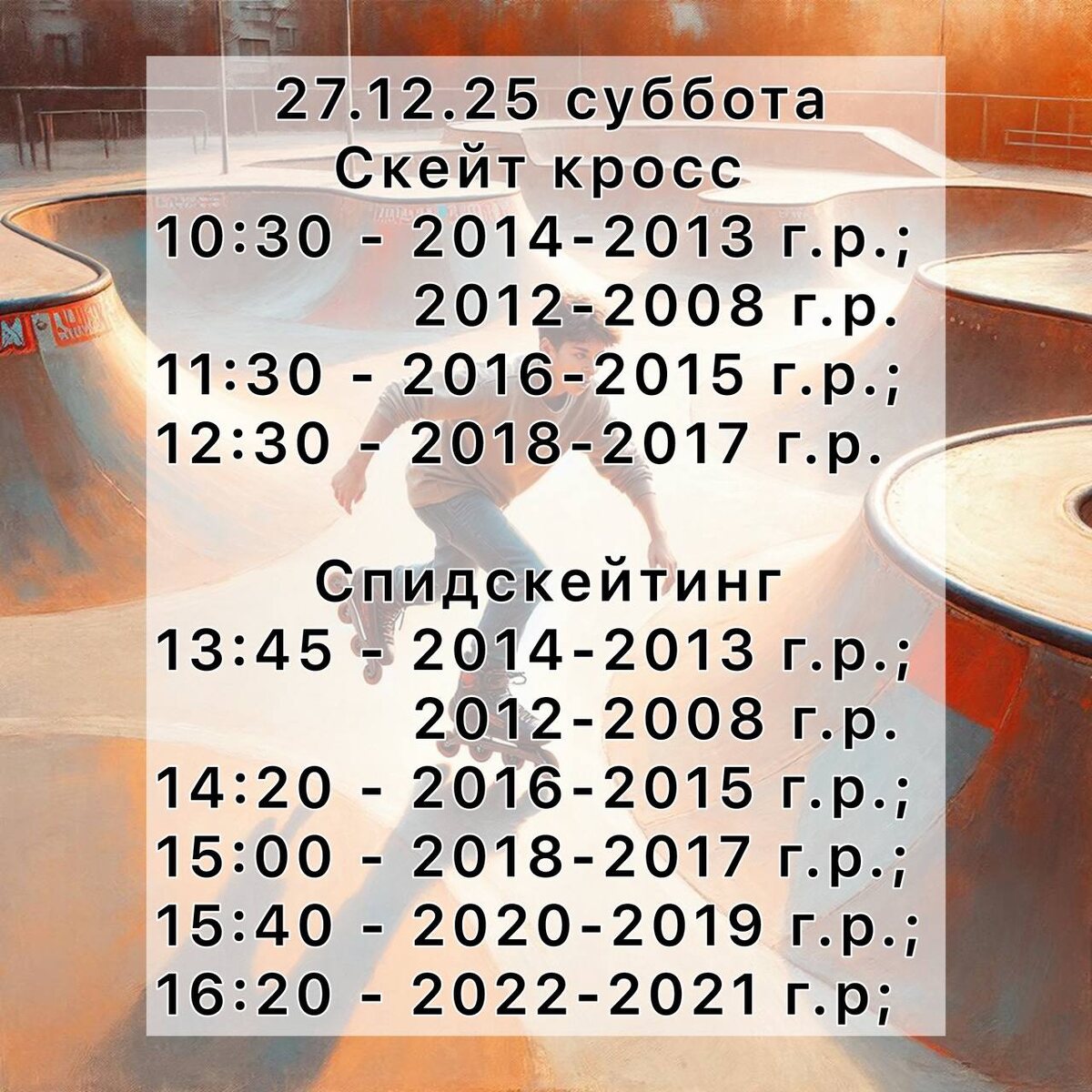 Будьте внимательны время стартов на «Спидскейтинге» 🛼сменилось. Для наглядности вам сделали картинку!!