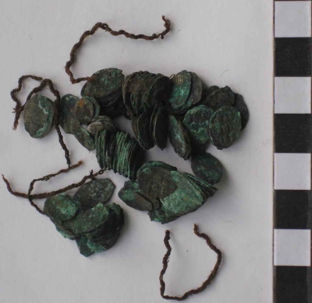 Второй клад значительно меньше, но имеет очень интересный контекст. Он был обнаружен рядом с печью в землянке, исследованной на участке по переулку Достоевского, 14. Здесь в маленькой рытвине, прикрытой обломком керамики в маленьком обрывке ткани были замотаны 24 серебряных копейки «чешуйки», отчеканенных при Петре I.