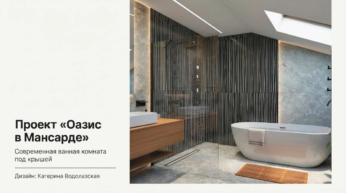 Разберем нестандартную ванную комнату в частном доме на последнем этаже. Покажу на примере моего проекта. Разложим на части спроектированное пространство, чтобы увидеть, какие именно принципы делают его таким гармоничным и удобным. И главный вопрос, на который мы сегодня ответим, какие именно дизайнерские ходы лежат в основе ощущения полной гармонии? Начнем с планировки, ведь по-настоящему хороший дизайн — это не только про красоту, но и про то, как им удобно пользоваться каждый день. Пространство очень четко поделено на функциональные зоны, но при этом сохраняется полное ощущение открытости и свободы перемещения. Гармония материалов задает общее настроение всей комнаты. Основной прием в данном интерьере: игра на контрастах. Органическое живое тепло натурального дерева тонко сбалансированно холодной строгой элегантностью серого камня на стенах и на полу. Это создает одновременно и напряжение, и идеальный баланс. Вывод, что ключевой момент — это очень строгая палитра. Отдельное вним