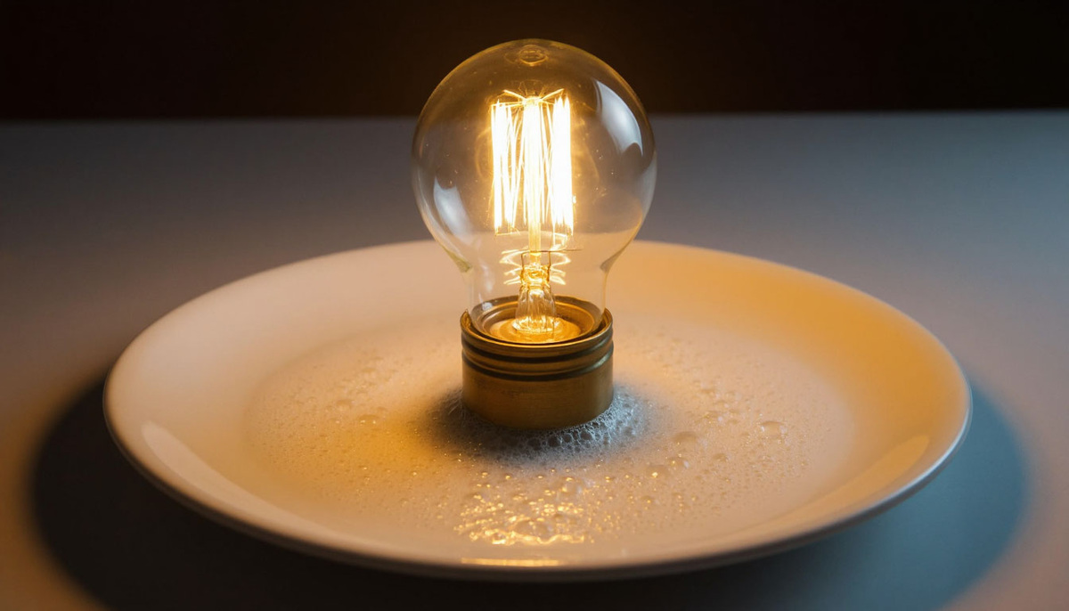 Беру лампочку. Сердце колотится (ну ладно, не колотится, но интересно же). Опускаю цоколь прямо в миску, касаясь жидкости и огурца. Затаил дыхание...