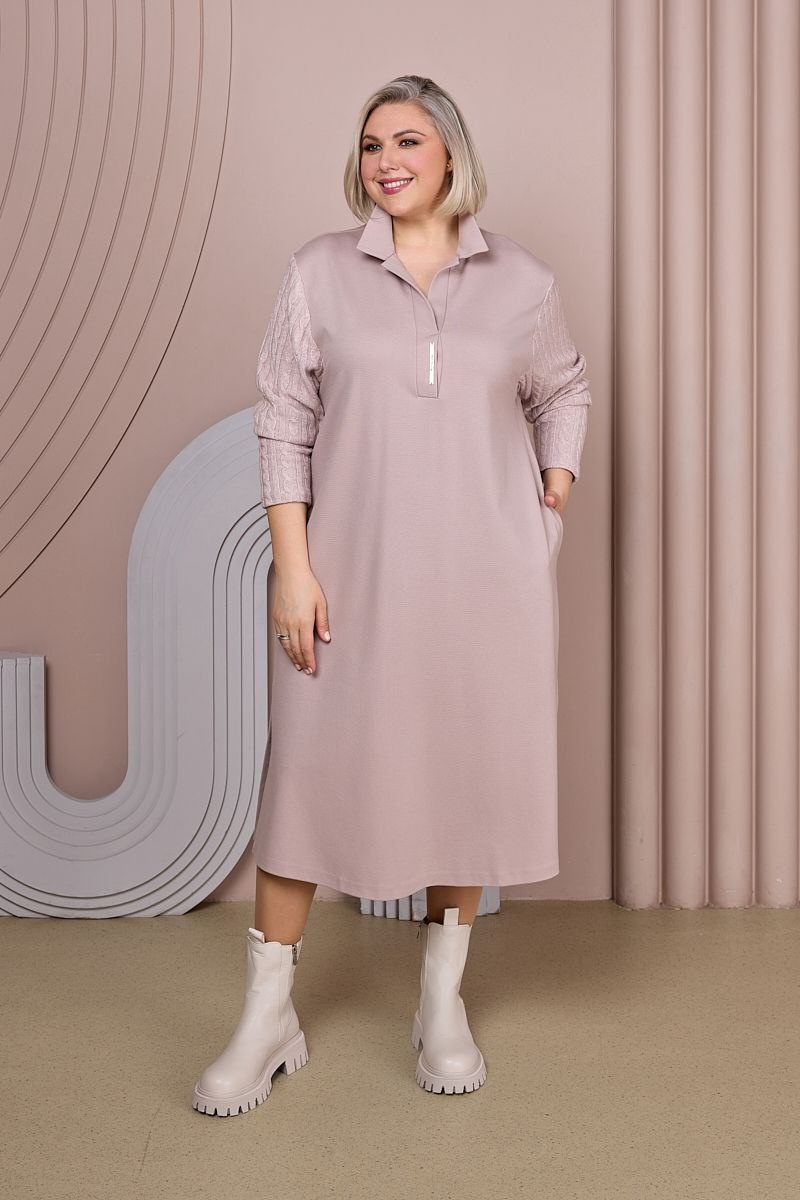 Это нежное пудровое платье изготовлено из плотной трикотажной ткани и украшено ажурными вязаными рукавами. Оно словно говорит о романтичной натуре своей хозяйки. Размеры: 48-62.